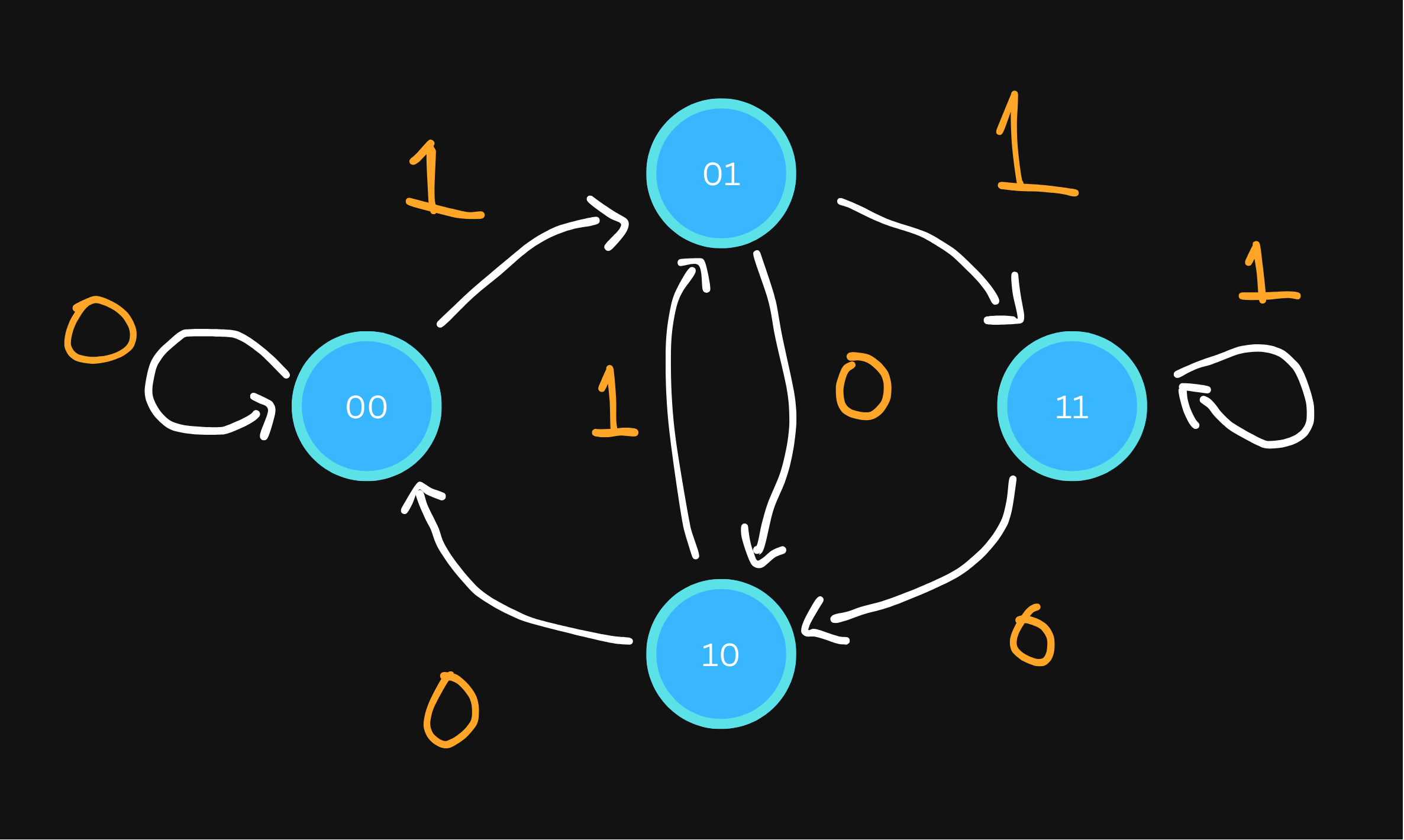 We can visualize the transitions - adding 00 or 11 - using an oriented graph whose nodes contain a string of length n1n-1.